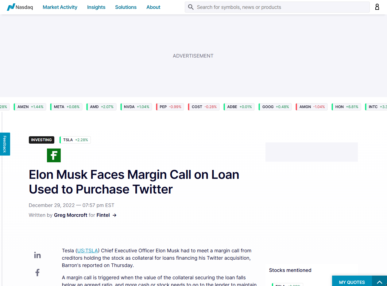 I found news articles from 2022 speculating about whether Elon could face margin calls if Tesla dropped too far. The risk was real.